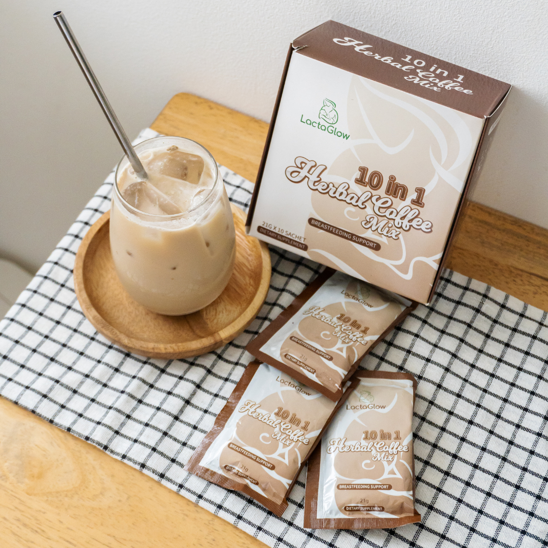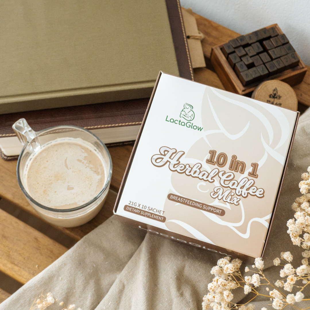 LactaGlow 10-in-1 Herbal Coffee Mix is a unique blend of herbal ingredients and coffee designed to support lactation and overall wellness for breastfeeding mothers.