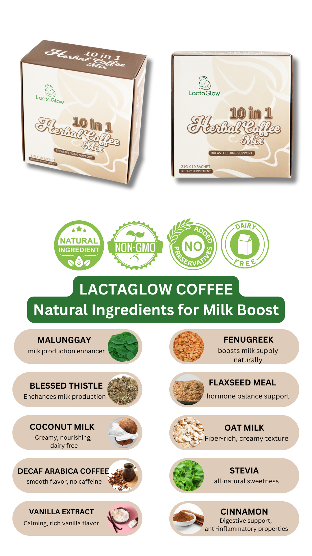 LactaGlow 10-in-1 Herbal Coffee Mix is a unique blend of herbal ingredients and coffee designed to support lactation and overall wellness for breastfeeding mothers.